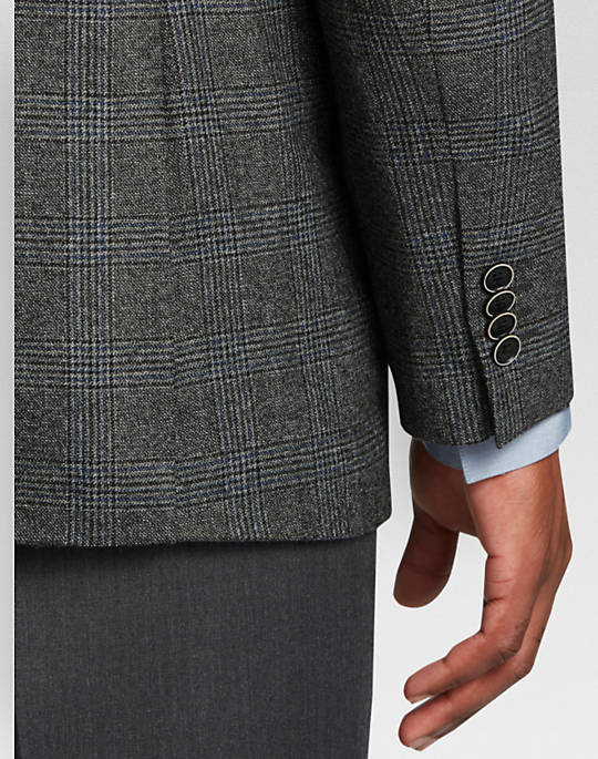 In a subtle gray plaid pattern, this softly constructed sport coat has a body conscious fit that is slimming and non-bulky. Wear it with your favorite dress-casual coordinates.